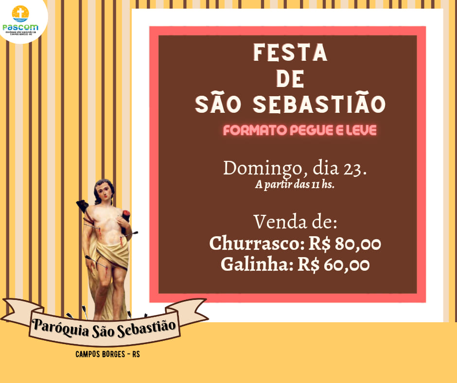 O Conselho Paroquial da Paróquia São Sebastião de Campos Borges realizará neste domingo, dia 23, a tradicional Festa de São Sebastião, padroeiro da cidade, com a venda de churrasco e galinha, no formato pegue e leve.